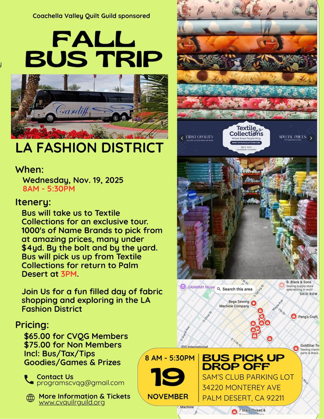 Meetings of the Coachella Valley Quilt Guild will be hybrid meetings -- in person at University of Riverside, Palm Desert Campus and on Zoom -- January through May and September through November. June, July and August will be Zoom only. December is our Holiday Luncheon.
